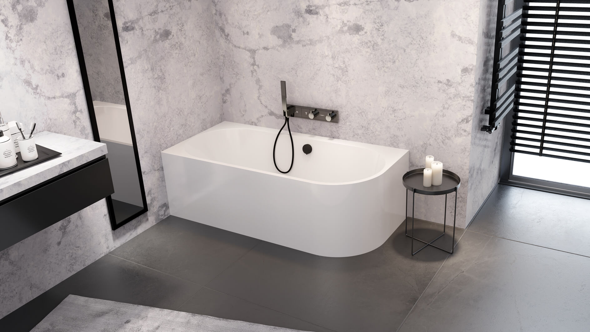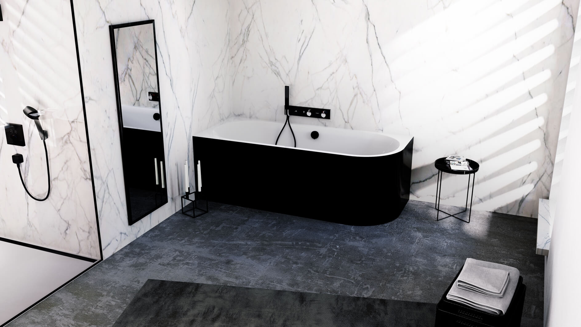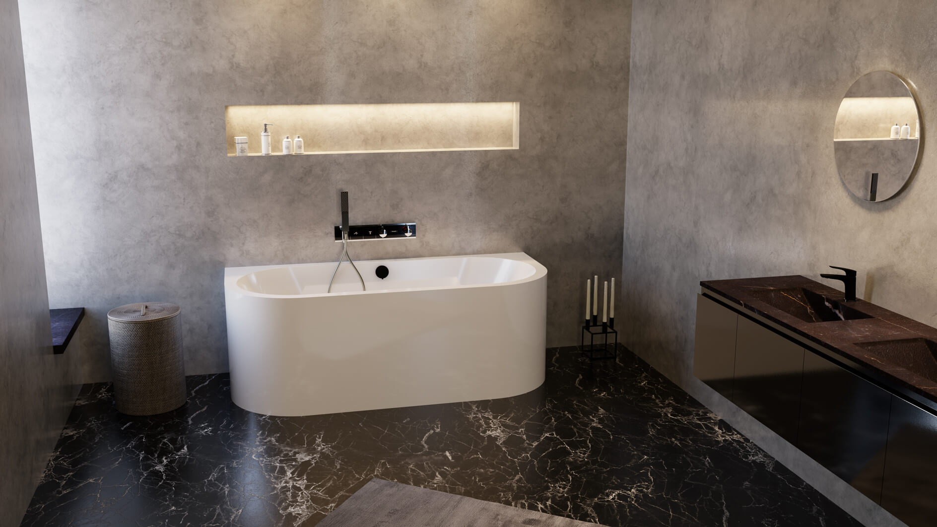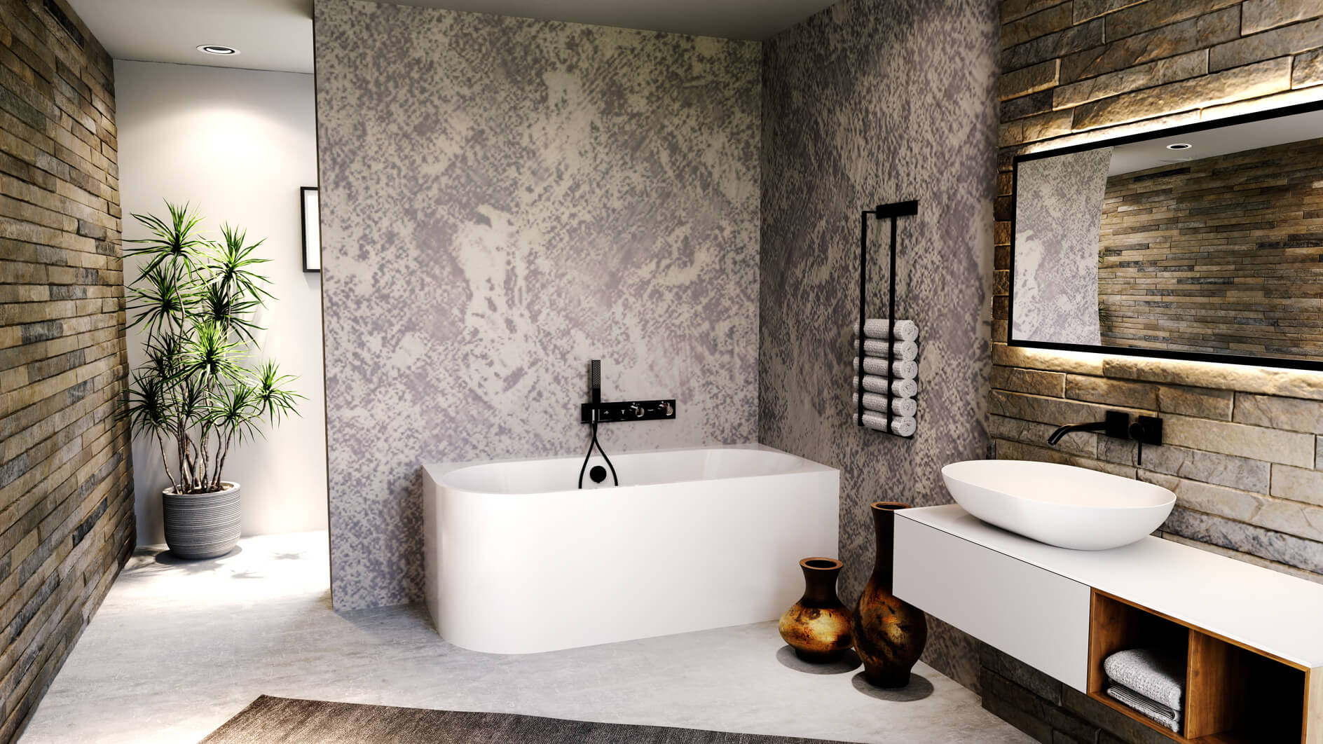 Klient požadoval soubor interiérových vizualizací koupelen pro prezentaci van. Preferoval kamenné obložení a jednodušší styl zaměřený na vany. Modely van dodal klient v 3DS souborech. Finální render měl rozlišení 7000 x 4500 px při 300 DPI.