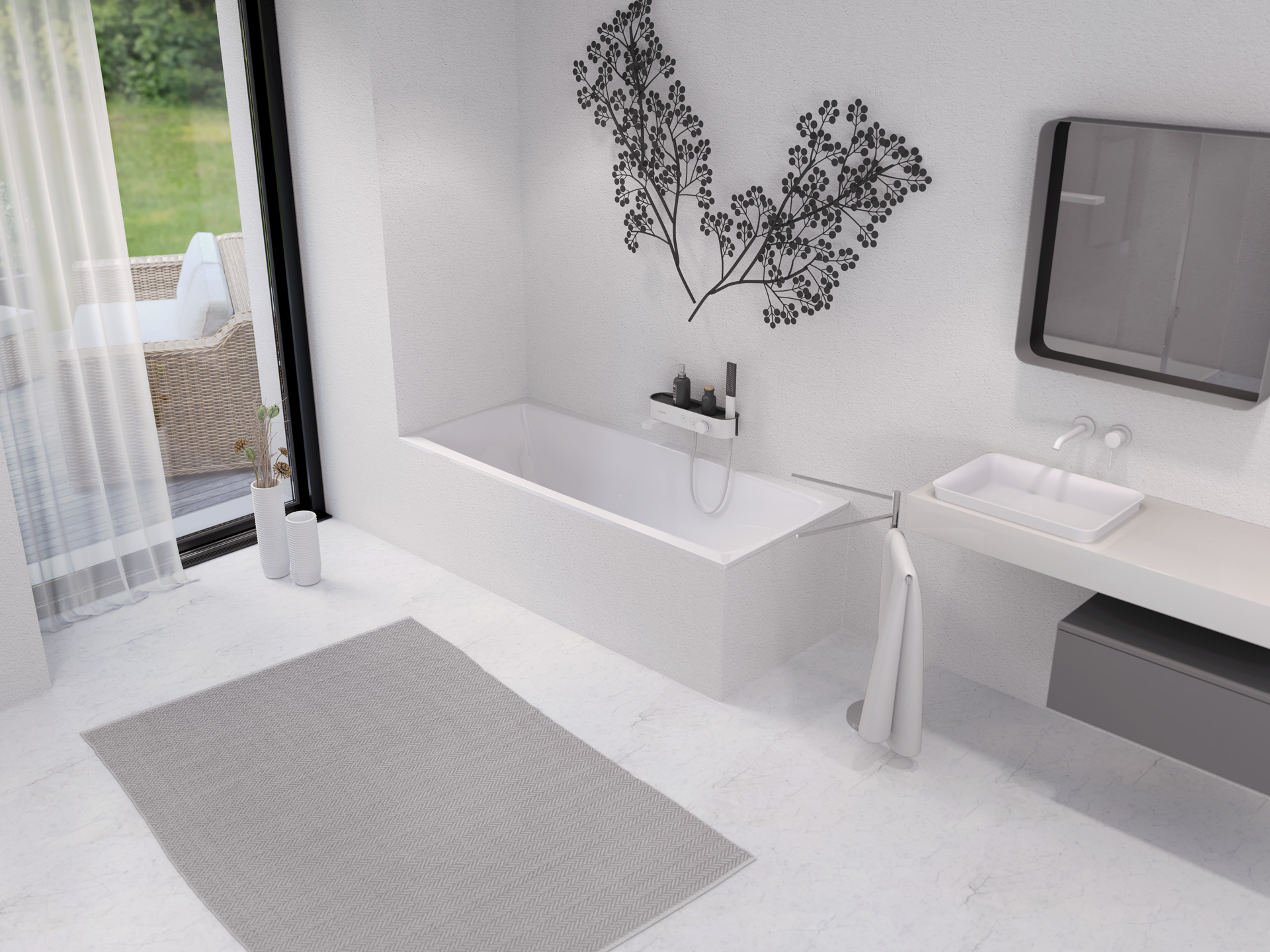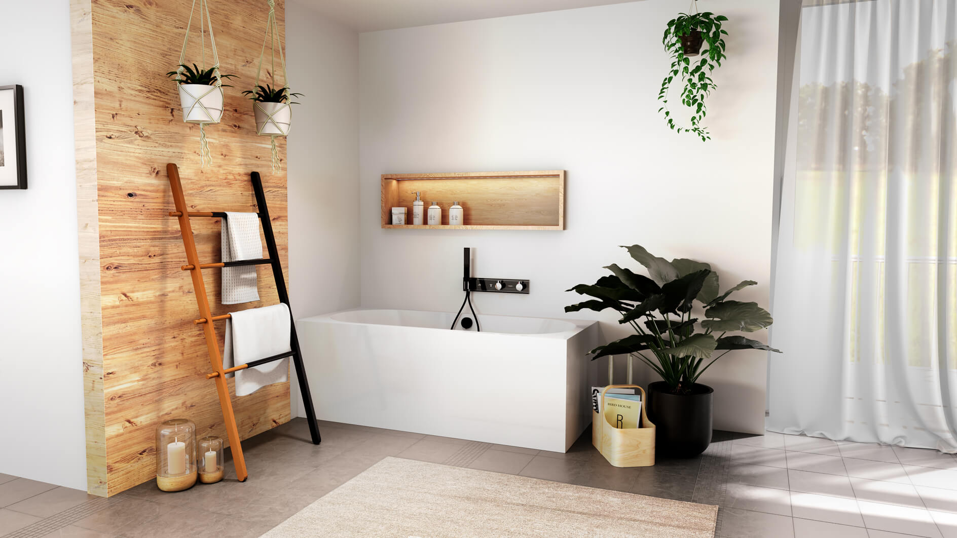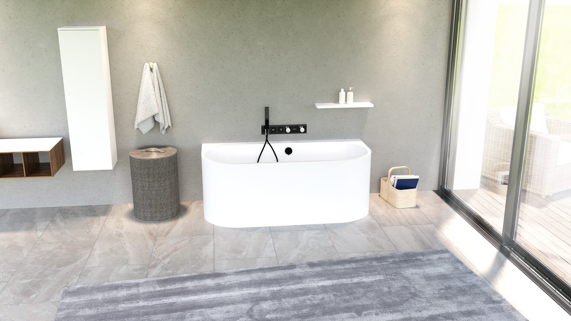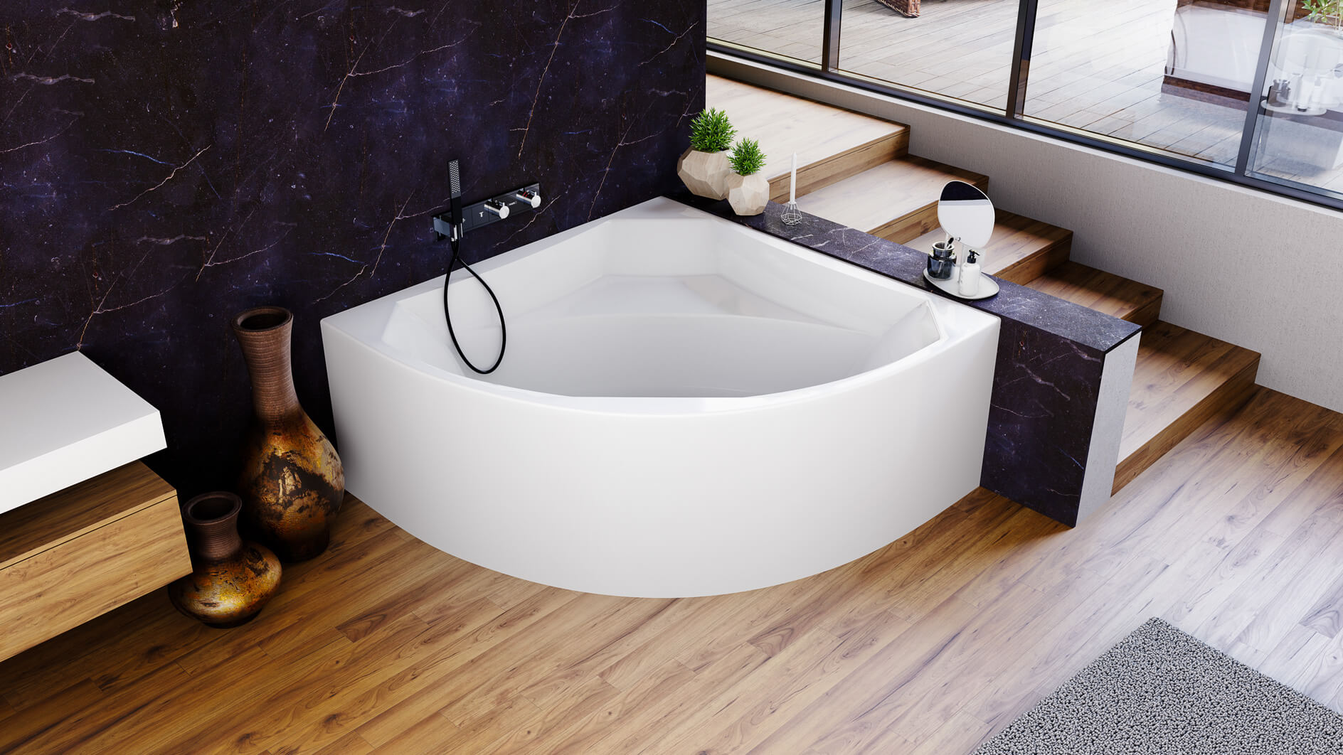 Klient požadoval soubor interiérových vizualizací koupelen pro prezentaci van. Preferoval kamenné obložení a jednodušší styl zaměřený na vany. Modely van dodal klient v 3DS souborech. Finální render měl rozlišení 7000 x 4500 px při 300 DPI.