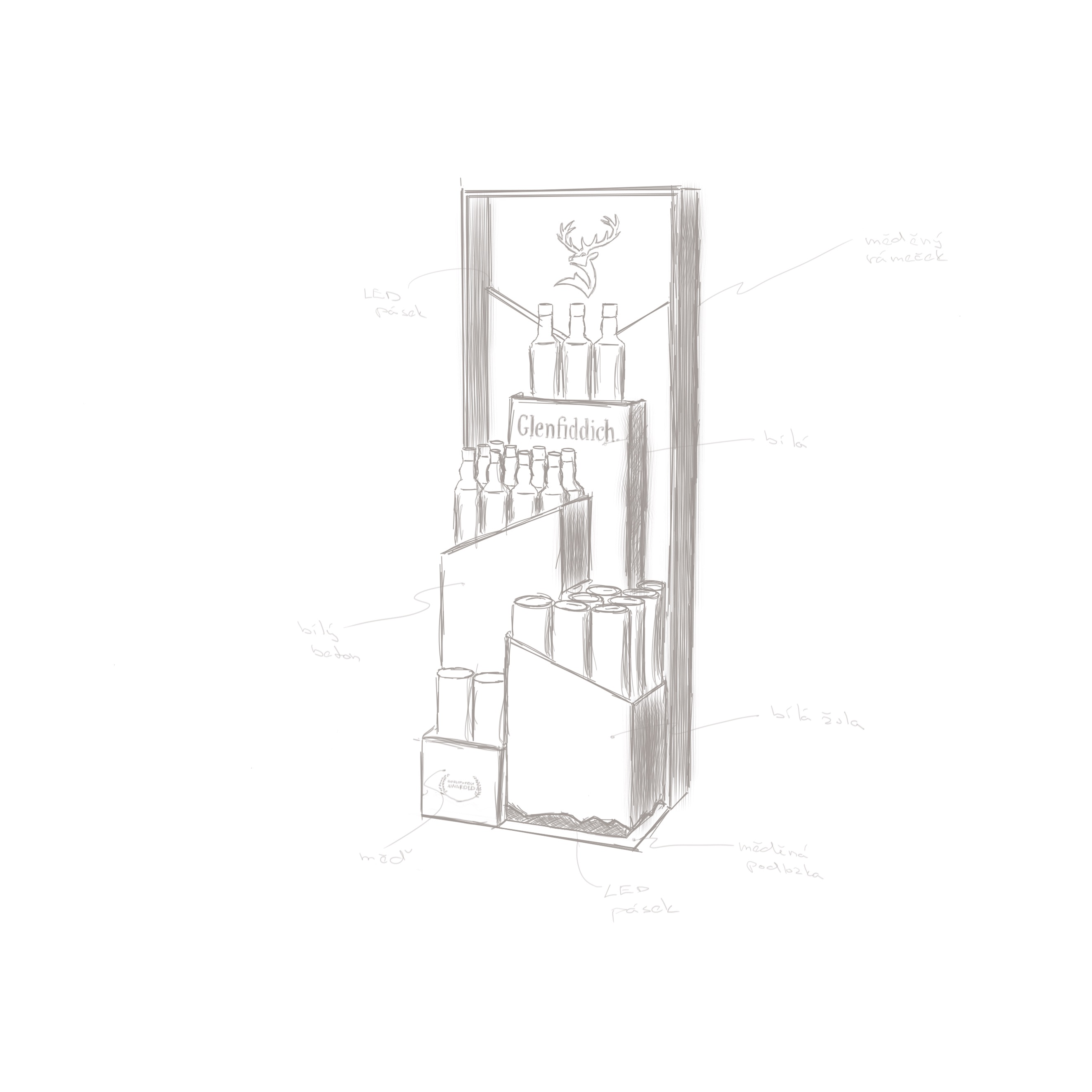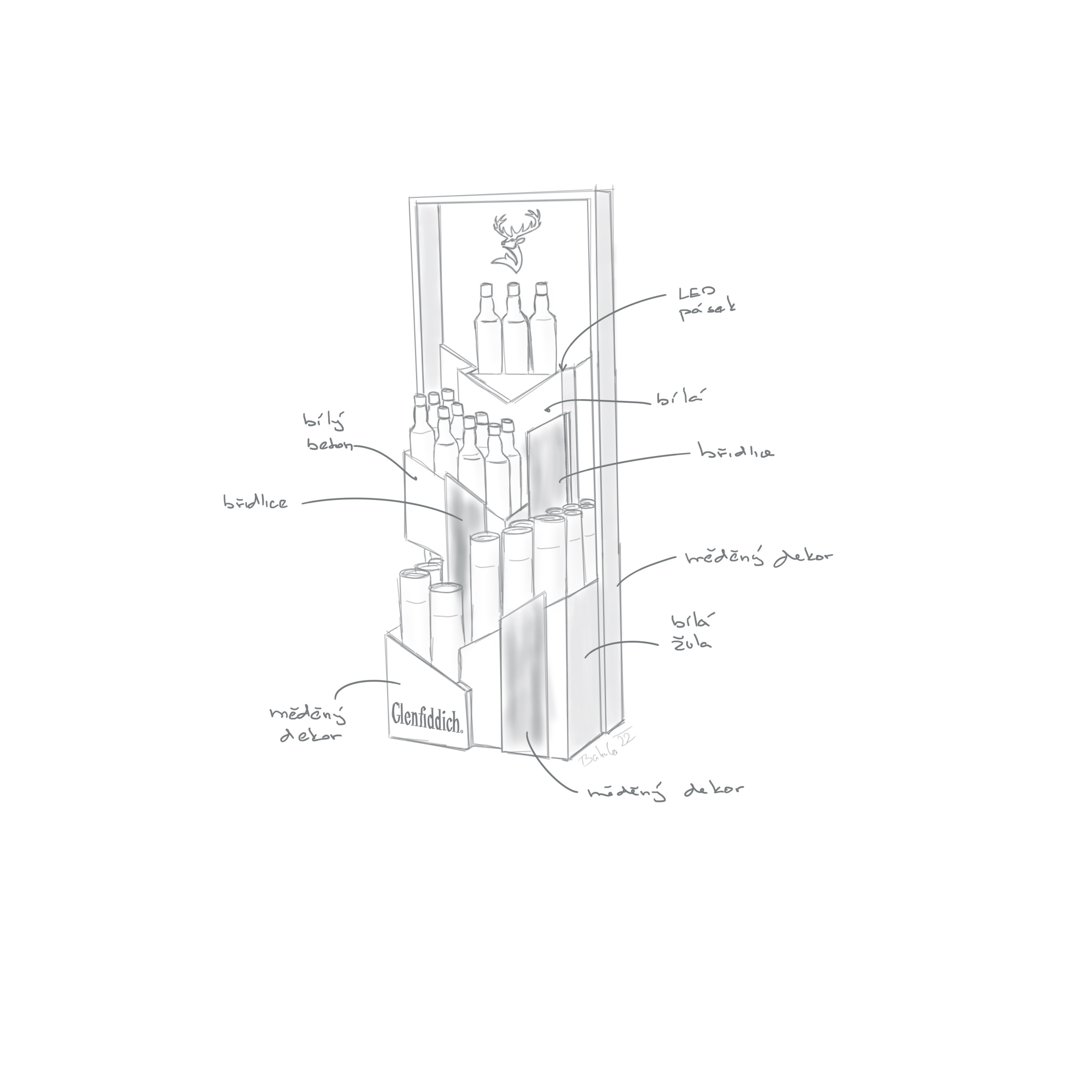 Tento projekt mě hodně bavil. Dobré podklady ze strany klienta byly třešničkou na dortu. Dobrý koncept prezentace značky umožnil kreativně vyřešit půlpaletový stojan výšky 150 cm. Detaily na stojanu provedené bronzovou fólií dodaly produktu punc luxusu a kvality.